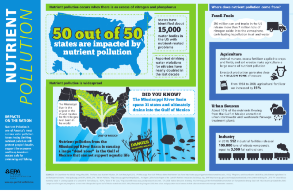Next, send students back to their small groups, and ask them to read the infographic What Is Nutrient Pollution? (https://www.epa.gov/nutrientpollution/infographic-what-nutrient-pollution) and discuss how the information provided can help them explain the events observed in the three photographs.