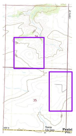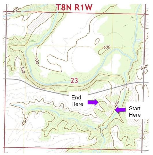 After students figure out how to read the lines on the map (via discussion or video), check for understanding by asking students to figure out what the change in elevation between contour lines is on the map of Avon, IL. Students should be able to figure out that there is a difference of 10 m between each contour line. If students struggle, have them look in the box with the red 23 (red numbers are section numbers) found in Warren Co. T8N R1W (image below). Students should be able to see two labeled contour lines, 600 and 650. As they count the contour lines between the two labeled contour lines, they should determine there are 4 lines. This means that each line needs to increase by 10 m to move from 600 to 650.